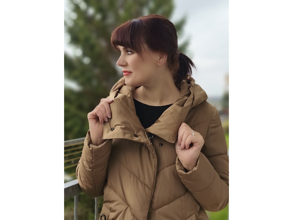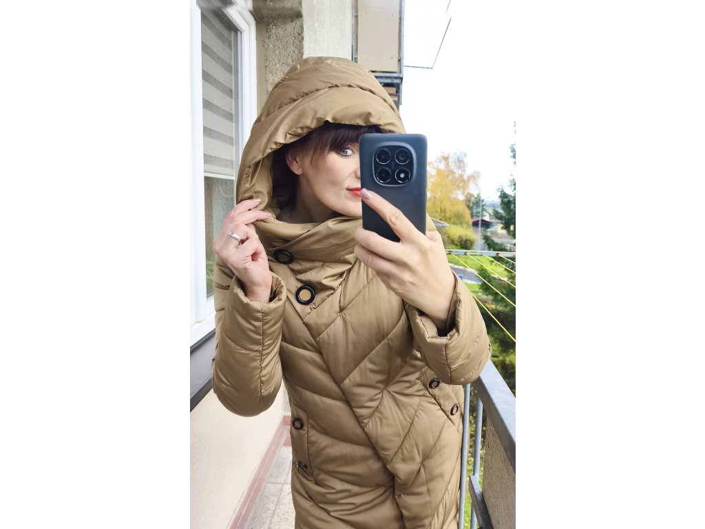 Je to prošívaná (puffer) bunda/kabát delšího střihu, sahající přibližně do půlky stehen.